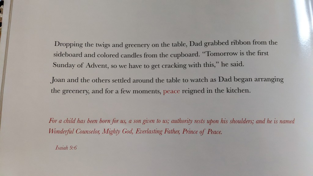 Each written page highlights a word related to the Christian faith, and then presents a scriptural verse which uses that word. When reading the book to a pre-reading child, an adult could put their finger under the focus word and have the child locate the word in the scripture. Then, the adult could read the scripture and pause before the focus word so that the child could “read” it. If the book is read this way several times during Advent, before long, the child will be able to recognize these words. Wouldn’t it be wonderful if children would fill their early vocabulary with words like “peace”, “joyful”, “light” and “gladness” and listen to these words within the Word of God?