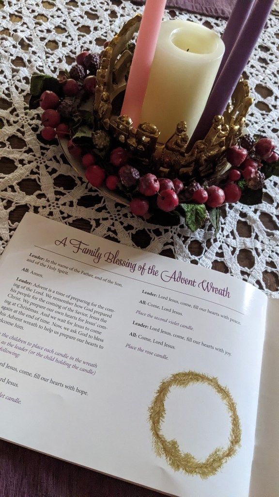 Decorating for Advent in our family, looks like a bit like paired-down Christmas decorating; I try to save the flashy decor for later but I do emphasize the theme of “light”. We will put electric candlelights in the windows, as we wait for Christ, the Light of the World, and we will display a wooden nativity scene outside and also a poinsettia welcome mat for visitors. We will wait to put up a lit Christmas tree until Gaudete Sunday and add decorations on Christmas Eve before going to Midnight Mass. We will put out our Advent calendars (felt, Scriptural, and chocolate ones!) We will also bless and decorate our Advent wreath.