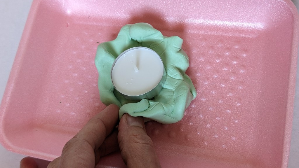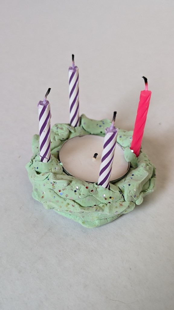3. Form the clay around the tealight making a few lumps here and there to represent leaves and give the wreath texture. There needs to be enough clay around the sides of the tealight in which to stick the birthday candles.