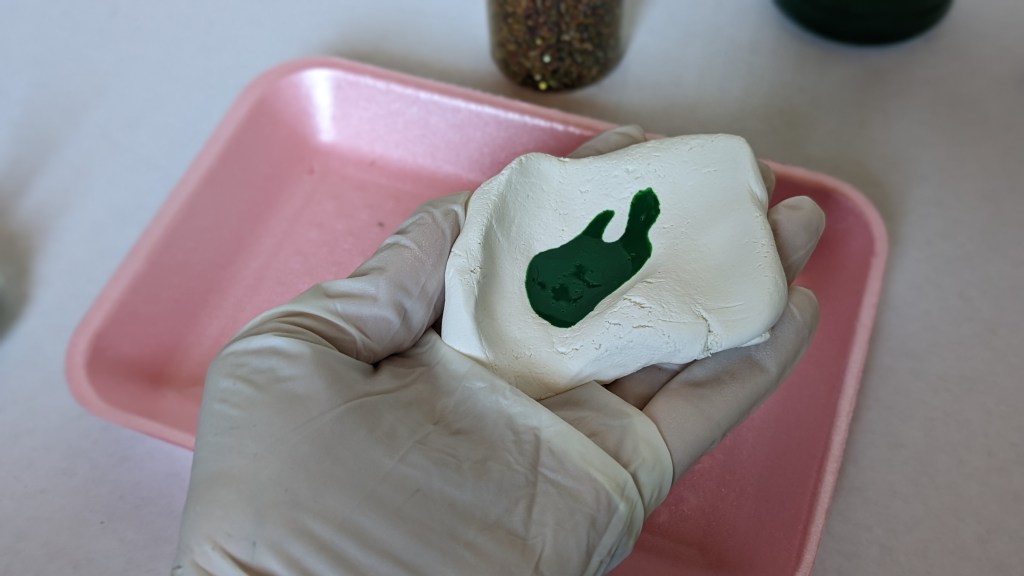 - If using white Crayola Model Magic, add a small amount of green paint or food coloring to the center of the clay and work it in. You may have to add more paint, a little at a time to get it the color you would like. I was satisfied when the clay became a soft pastel green. If using blue and yellow Crayola Model Magic, mix half a small amount of each color together until you have a fist-sized green ball.