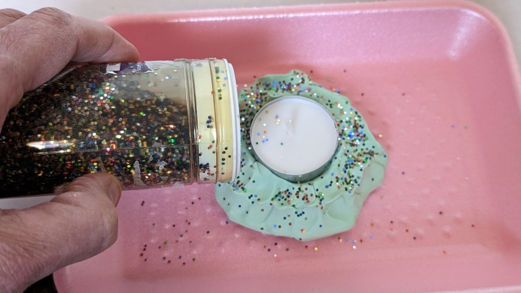 4. Add glitter to the clay around the tealight.